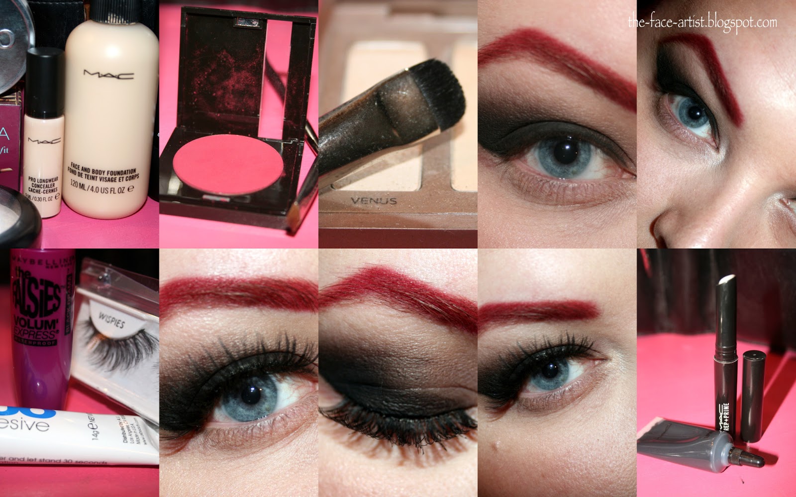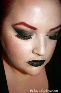 Here's what we're going for. It's a dark smokey eye all focused on the top lid with a clean under eye (which on the day of the concert was where I added some MAC Reflects Pearl Glitter) and a black lip completely by strong arched red brows to match my hair.